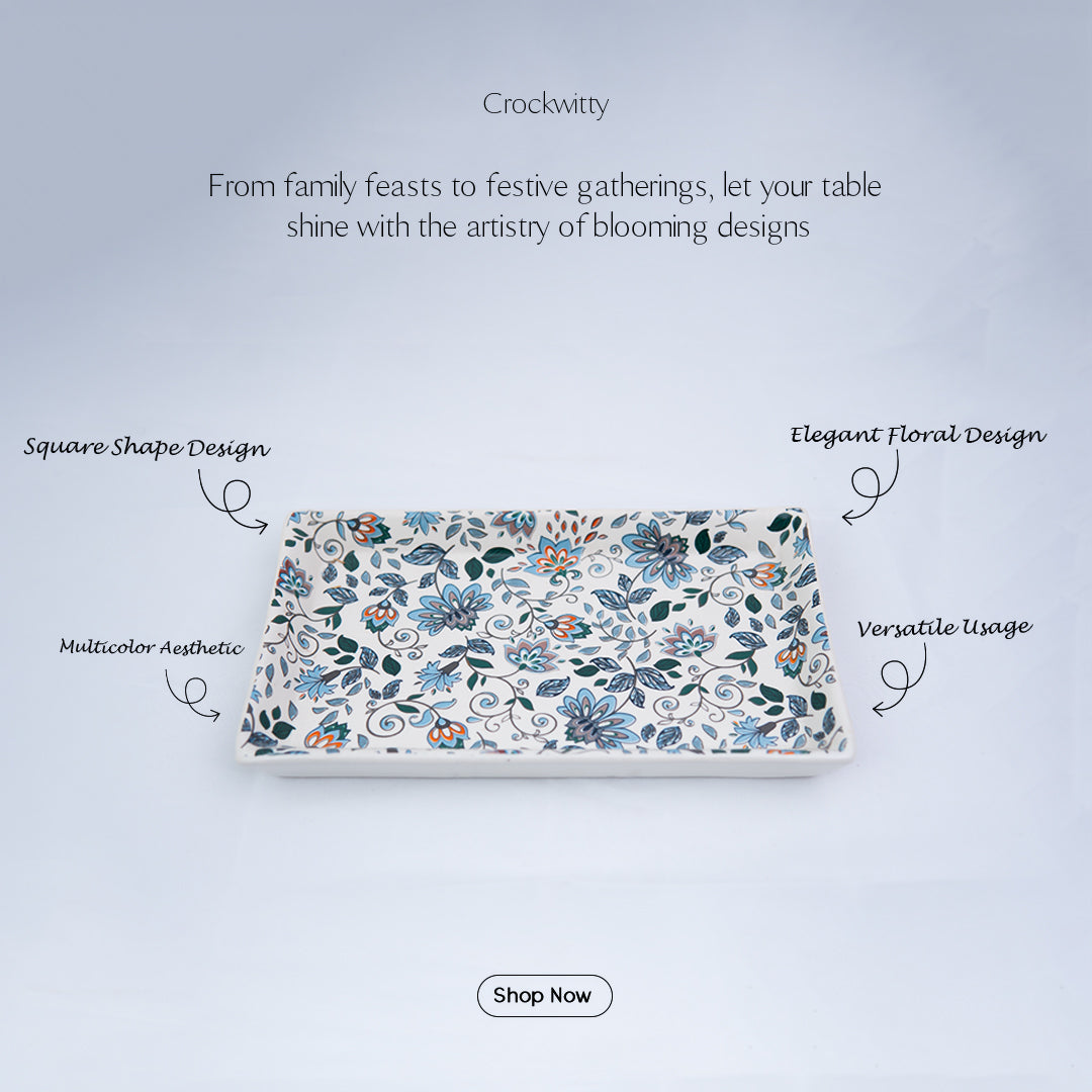 Designed with a sleek rectangular silhouette, each platter features intricate multicolour floral patterns that add warmth, sophistication, and visual appeal to everyday meals and special occasions. Whether you’re serving appetisers, desserts, snacks, starters, or festive treats, these platters offer versatile usage across casual dining, family gatherings, dinner parties, and celebrations.