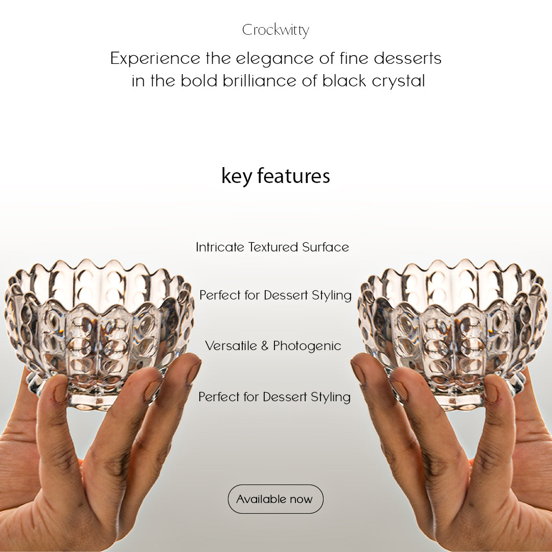 Indulge in elegant dessert presentation with the Crockwitty Black Crystal Dessert Cup, a luxurious addition to your dessert and tableware collection. Designed to elevate sweet moments, this dessert cup features an intricate textured crystal pattern finished in a rich black tone, creating a striking contrast that enhances the visual appeal of every dessert served. Inspired by contemporary luxury aesthetics, it transforms everyday desserts into restaurant-style presentations.