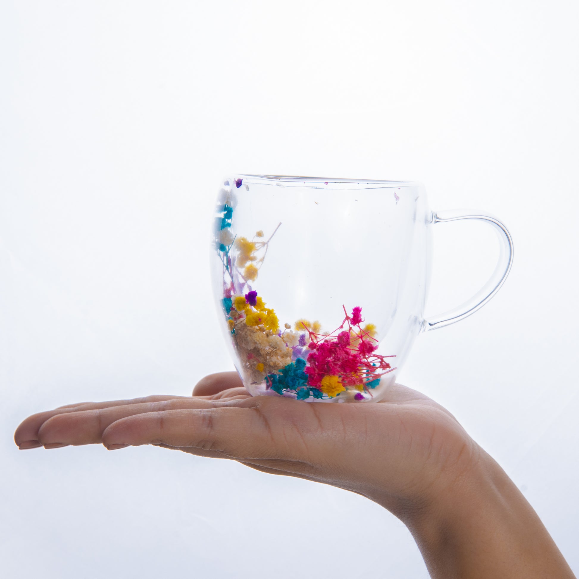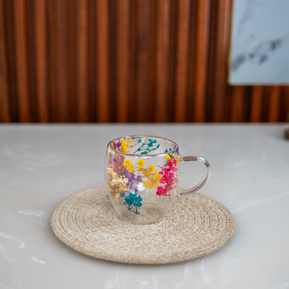 Floral Double Wall Mug – 250ml | Elegant Glass Mug with Floral Design