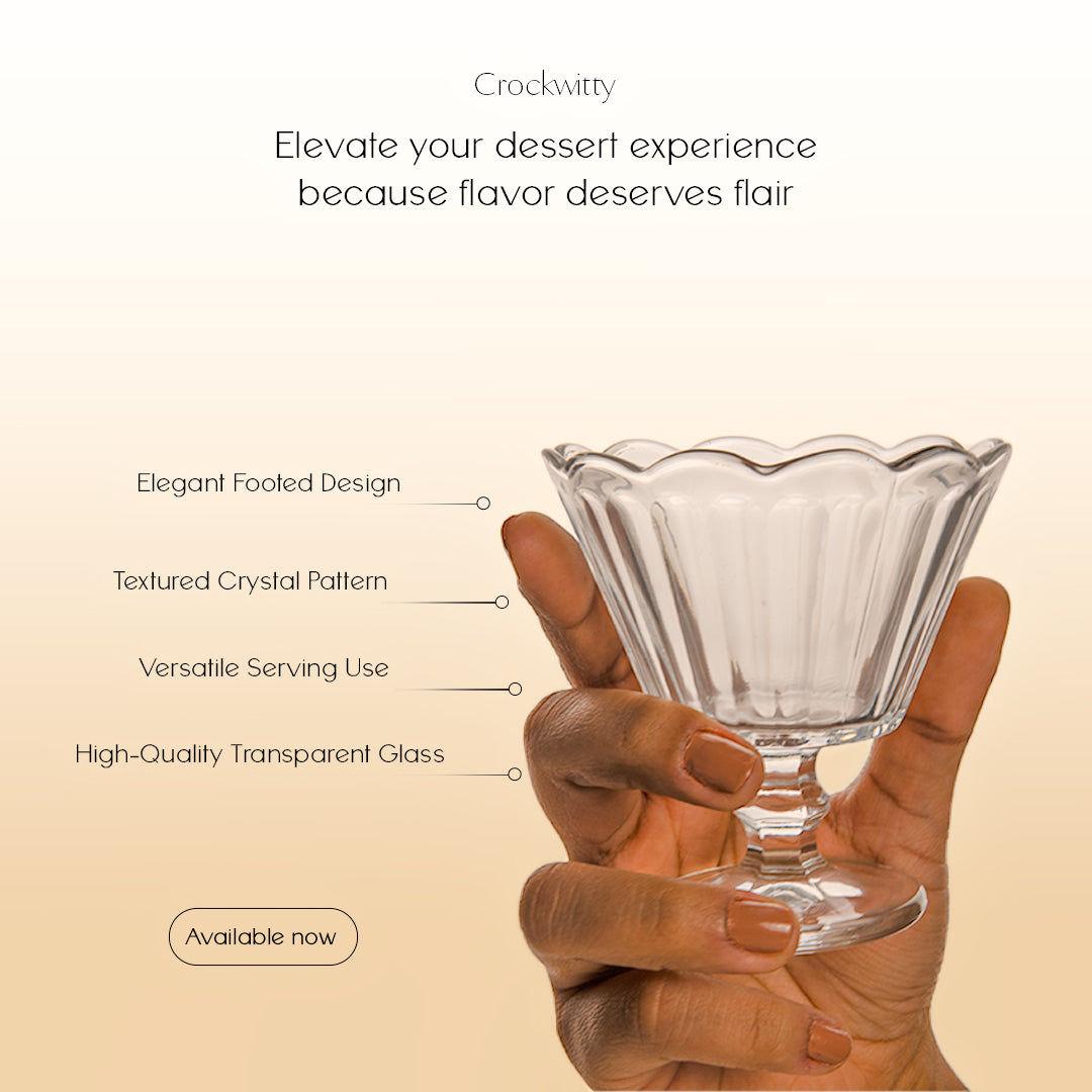 Transform every sweet creation into a showpiece with the Crockwitty Footed Dessert Cup, thoughtfully designed to add elegance, height, and charm to your dessert presentation. Crafted from high-quality transparent glass, this dessert cup features a beautifully textured crystal pattern and a classic footed base that brings a refined, vintage-inspired aesthetic to modern tables.