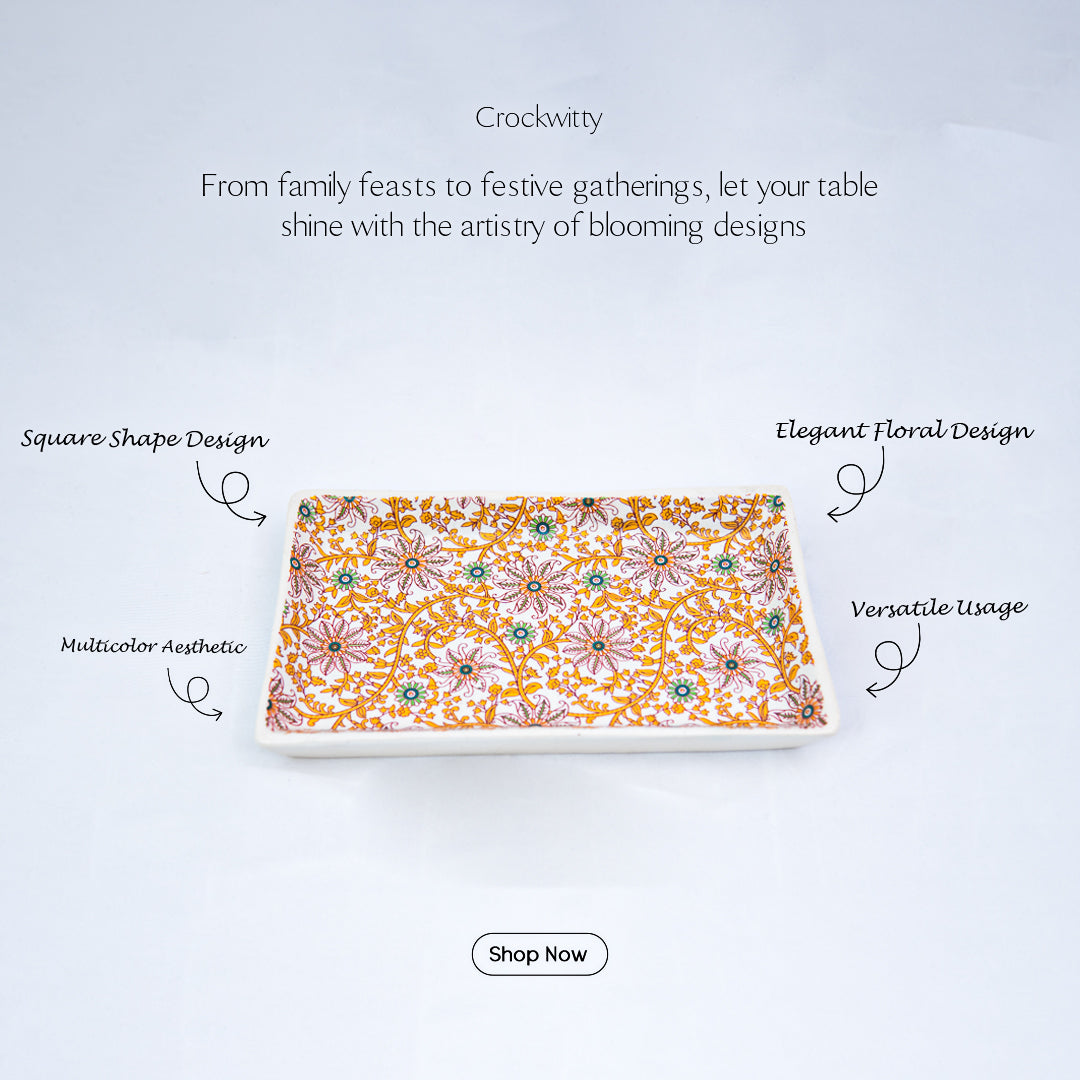 Elevate your dining and hosting experience with the GoldenVine Ceramic Chaat Rectangular Platter Set (2-piece), thoughtfully designed to blend artistic beauty with everyday functionality. Crafted from premium-quality ceramic, these platters feature an intricate multicolour floral design with golden detailing, inspired by classic elegance and contemporary table aesthetics.