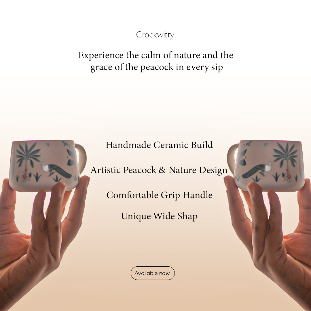 Introducing the Crockwitty Peacock Bliss Cup Set, a handcrafted ceramic collection inspired by the elegance of peacocks and the serenity of nature. Designed to bring artistry to your everyday moments, each cup features delicate hand-painted peacock motifs, botanical elements, and a soothing earthy tone that elevates your tableware experience.