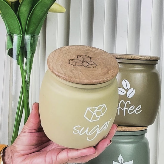 Crafted from premium-quality ceramic, each jar features a smooth matte finish, soft earthy tones, and minimal typography for coffee, tea, and sugar. The airtight wooden lid ensures freshness while adding a warm, natural contrast to the clean ceramic form. Inspired by contemporary minimal design aesthetics, this set elevates your countertop while keeping essentials neatly organised.